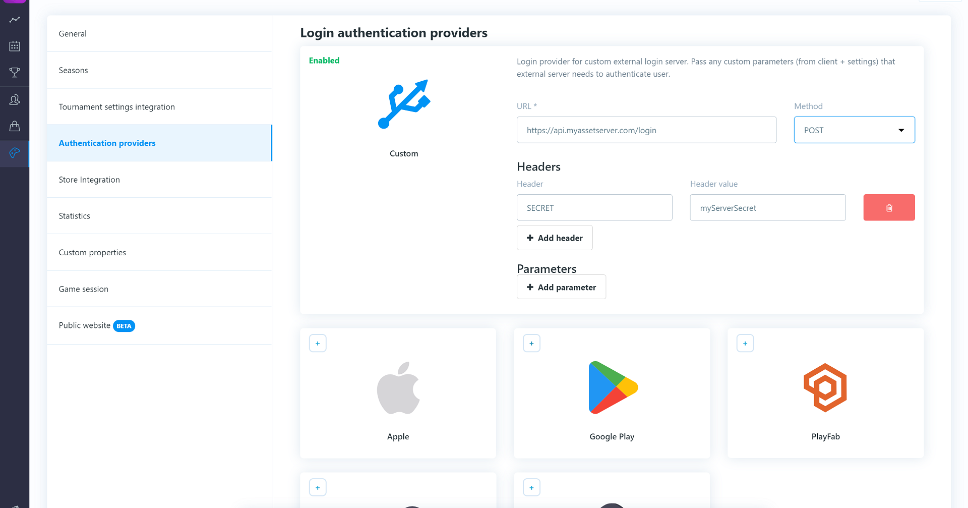 Once there is a endpoint that returns the required format, navigate to Game Settings/Authentication providers and enable custom authentication.