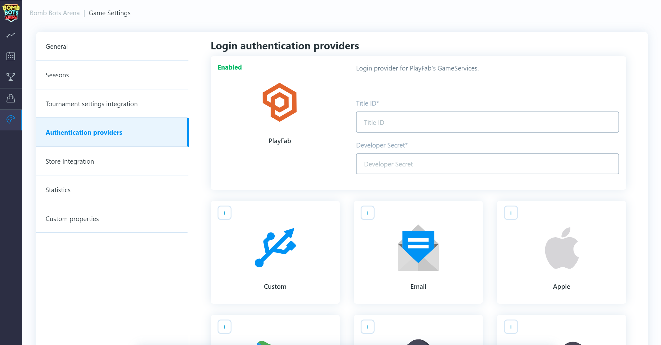 If you integrating with PlayFab services we strongly recommend enabling only PlayFab login provider in tournament dashboard. Also NOTE that if you will not use PlayFab login provider other integration features such as tournament signup or delivering prizes via cloudscript fail to work.