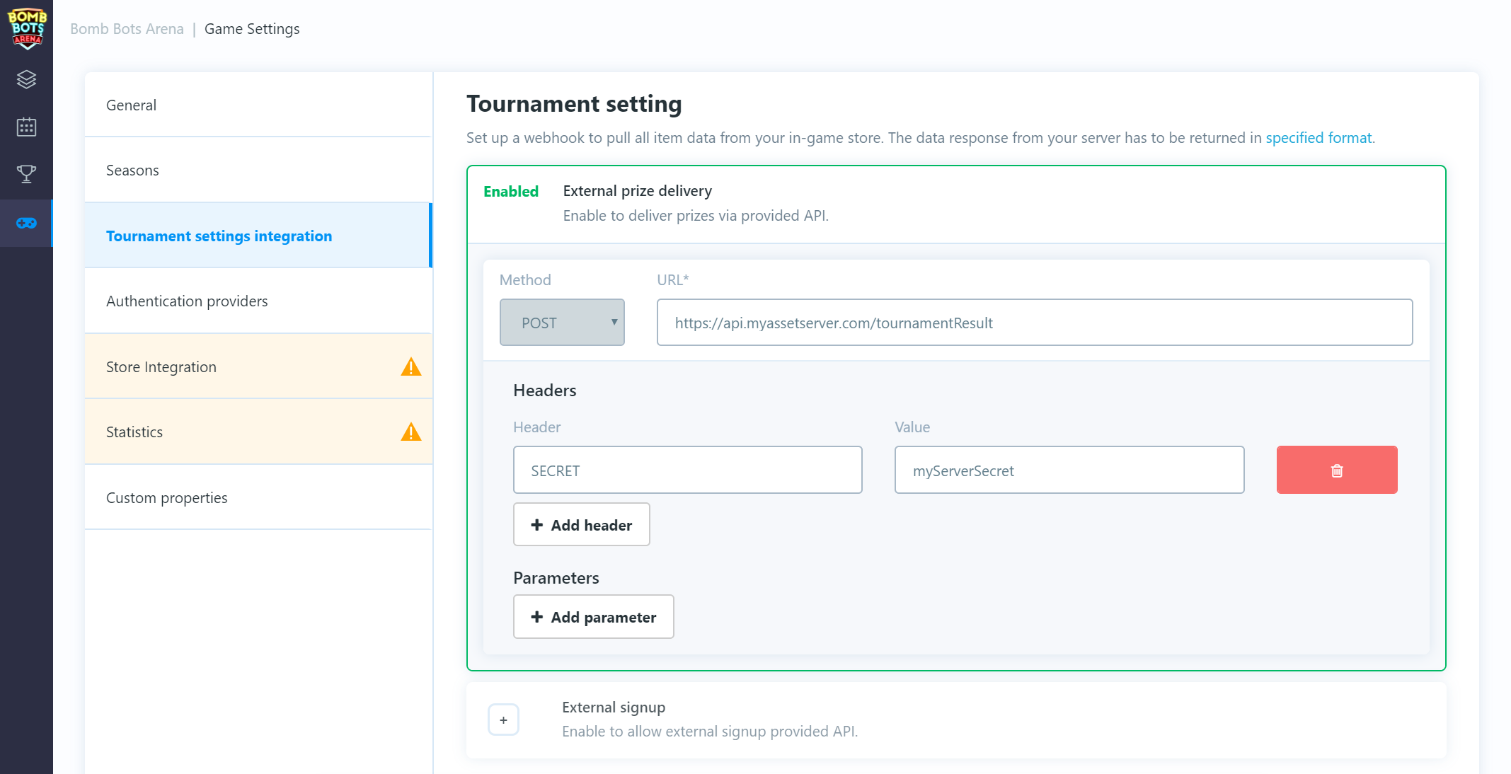 Once there is a endpoint that accepts the required JSON format navigate to: Game Settings/Tournament settings Integration and enable "external signup".