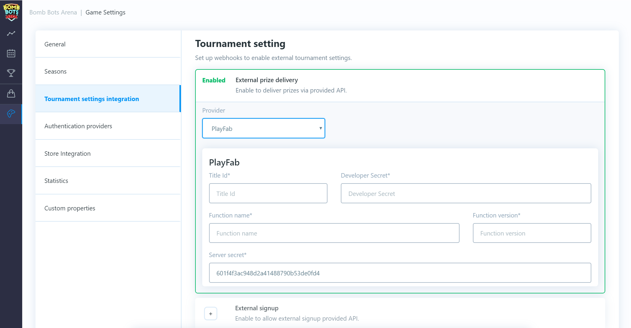 Once there is an endpoint that accepts the required JSON format, navigate to: Game Settings/Tournament settings Integration and enable "external prize delivery".