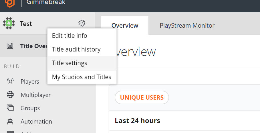 For PlayFab integration you will need TitleId and SecretKey. Login to your playfab dashboard, select your desired game and open settings screen.