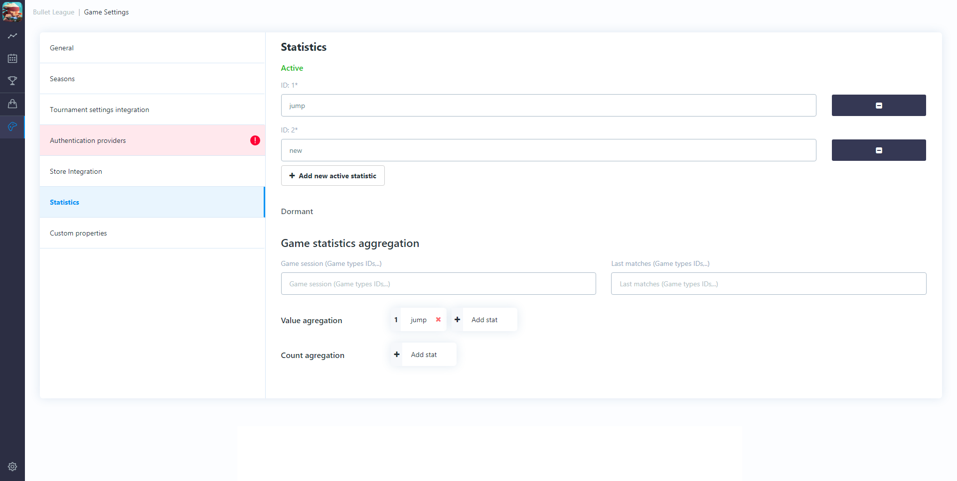 This section allows you to set up statistics that will be passed from your game to the tournament platform. As well as being used for potential tie-break situations, these are also automatically aggregated for each player for each season and (through the SDK) can be pulled back into the game and shown to players, or on leaderboards, or against tournament results, etc. (i.e., depending on your game type, you could show: what abilities/weapons the top players used to win tournaments, how many kills they had in tournaments, how many goals they scored, etc.).