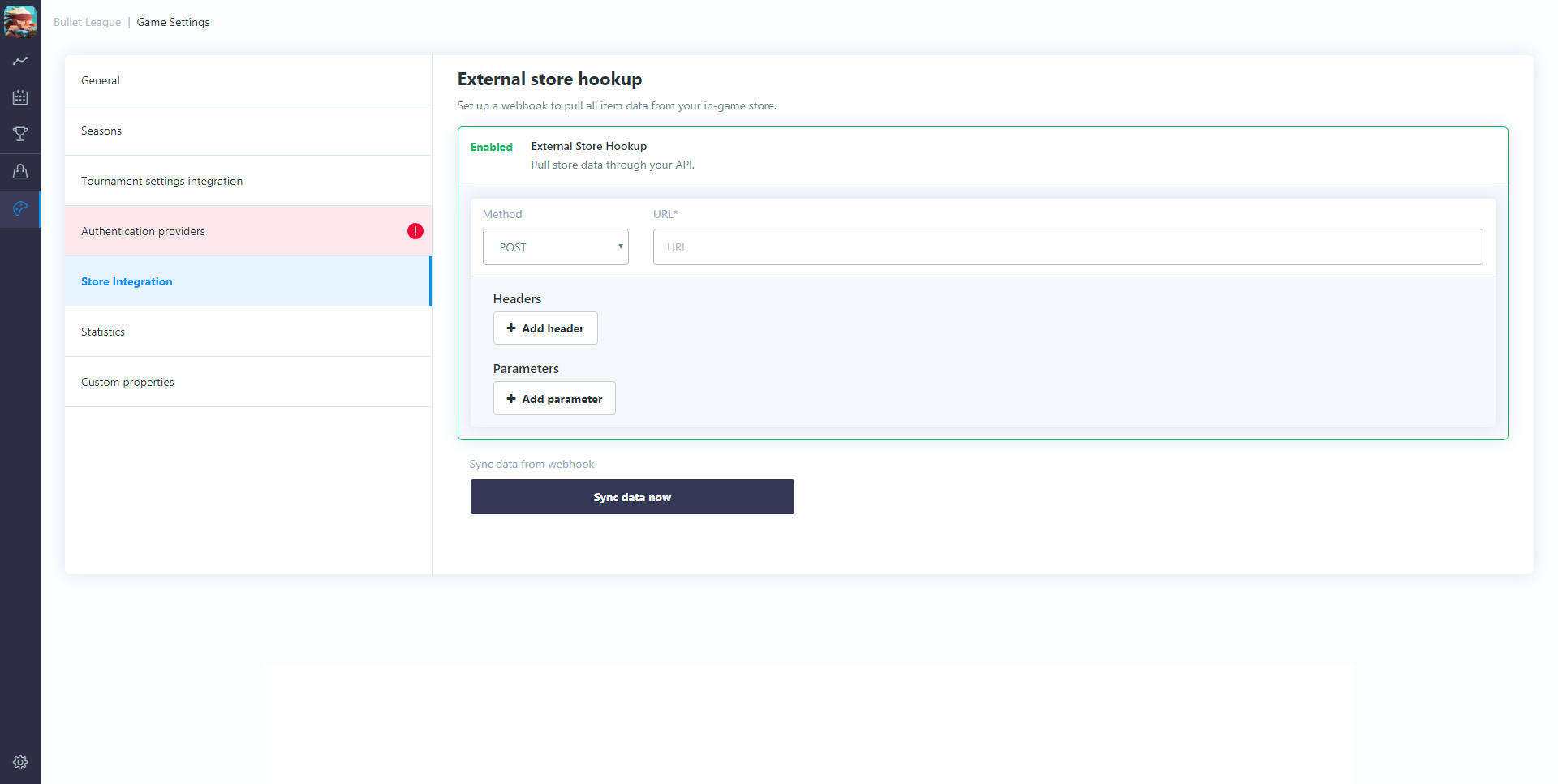 This section allows you to set up a webhook to pull in items from your in-game store/servers. This can then be used to set tournament requirements and award prizes, etc.