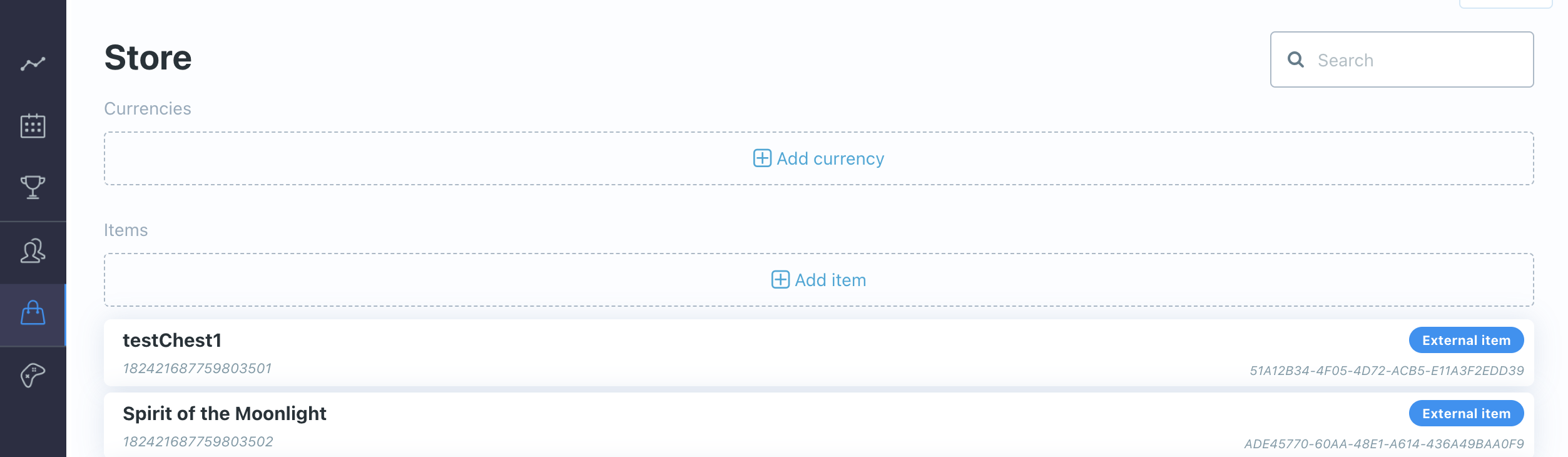 The Store section allows you to add currencies and items that can be used in the Rewards and Entry fee sections of tournament template setup.
