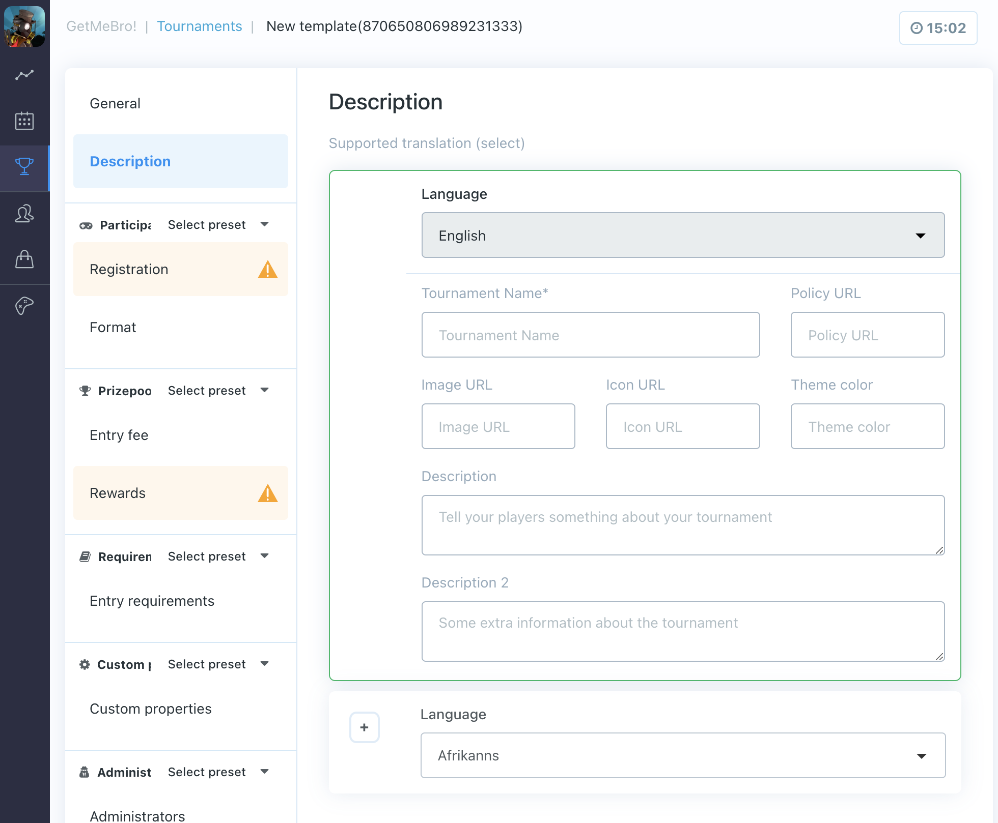 Select the language from the available list and click the + button. Do this for each language that you want to display tournament information in. All of this will be available to your game through the SDK.