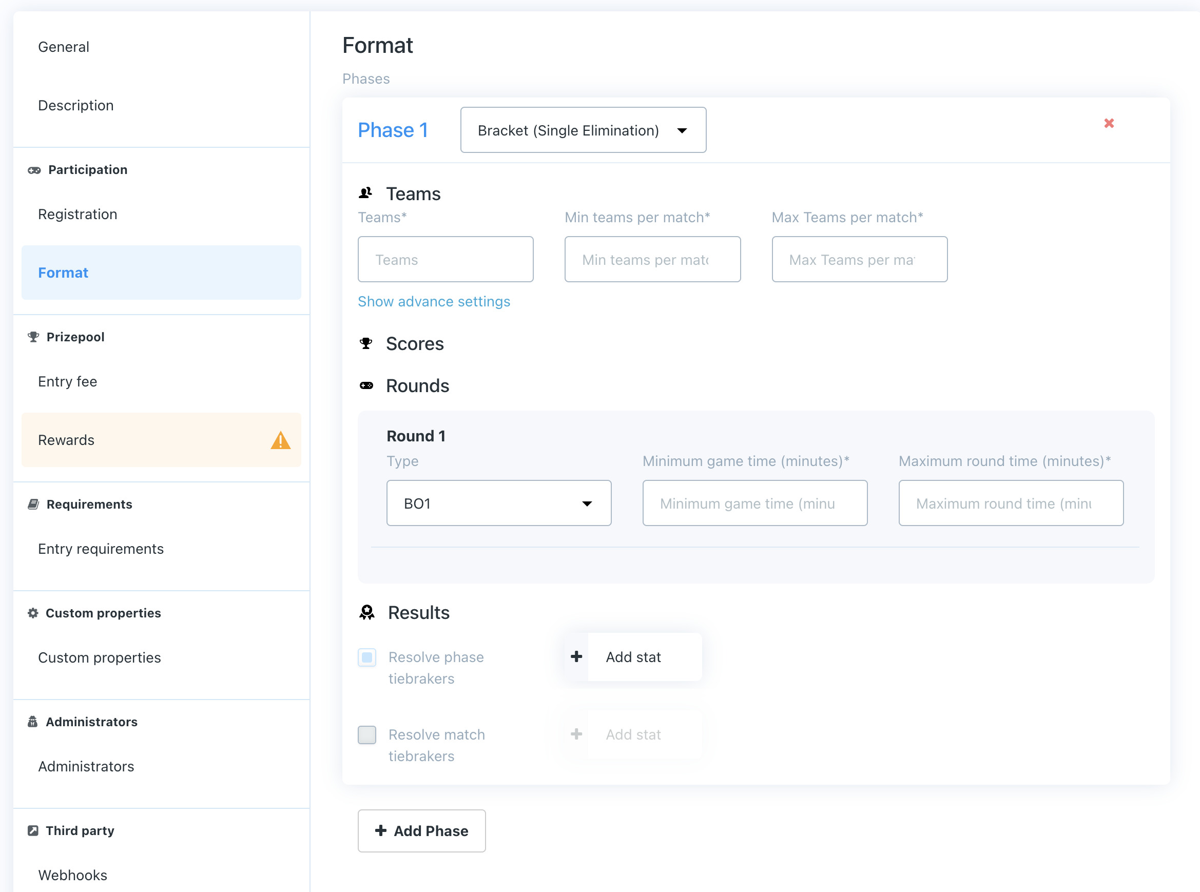 This section allows you to define the format of the tournament. Tournaments will consist of one or more phases, each phase will have multiple rounds (each round will have one match for each player/team), and each match can be made up of multiple games (i.e. best of 3). The platform will narrow the field of players/teams down until there is a winner/champion. The possible types of phases are as follows: