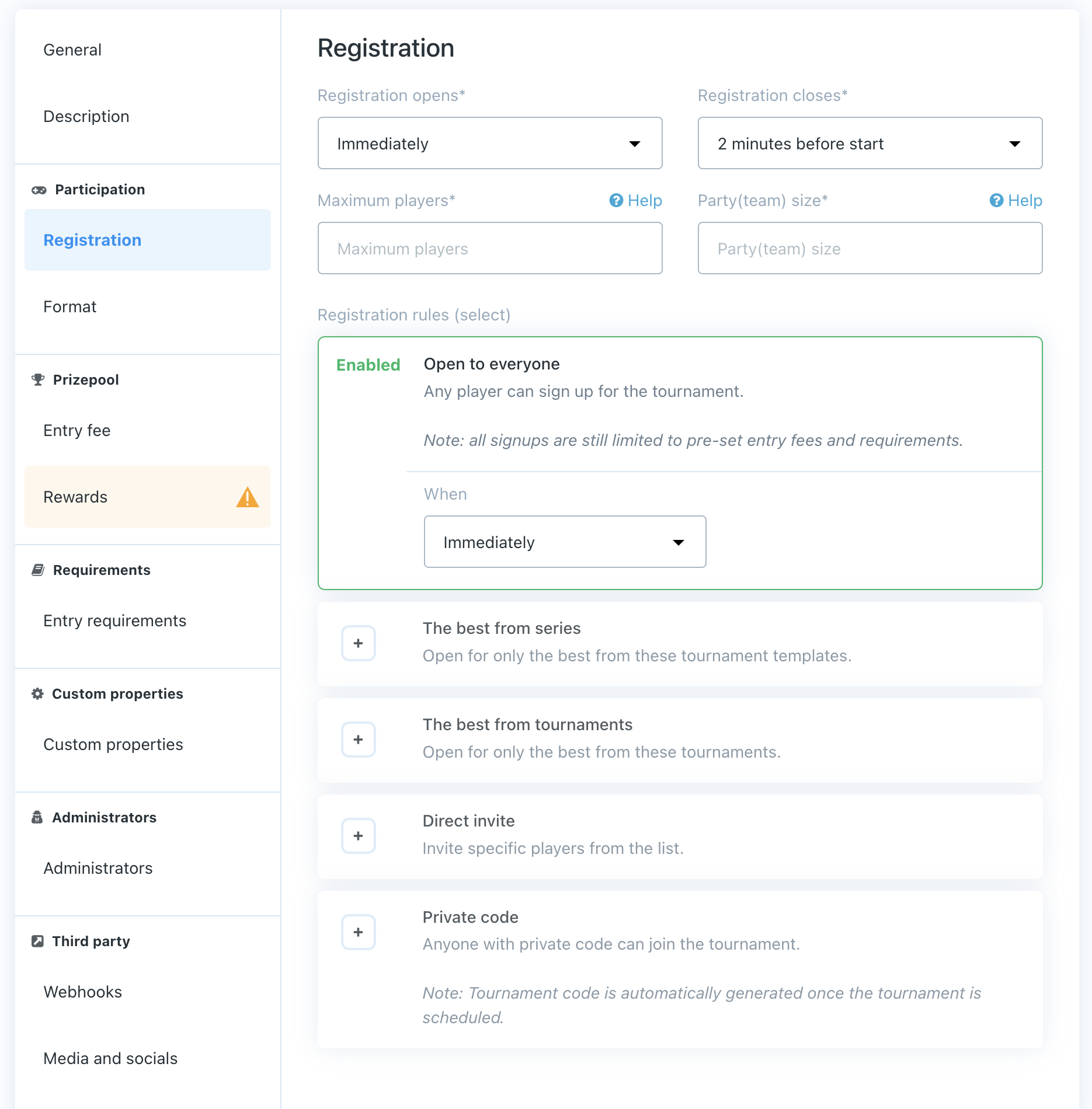 Specify who will be invited to the tournament. You can set multiple registration rules with different timelines, allowing for a phased registration process.