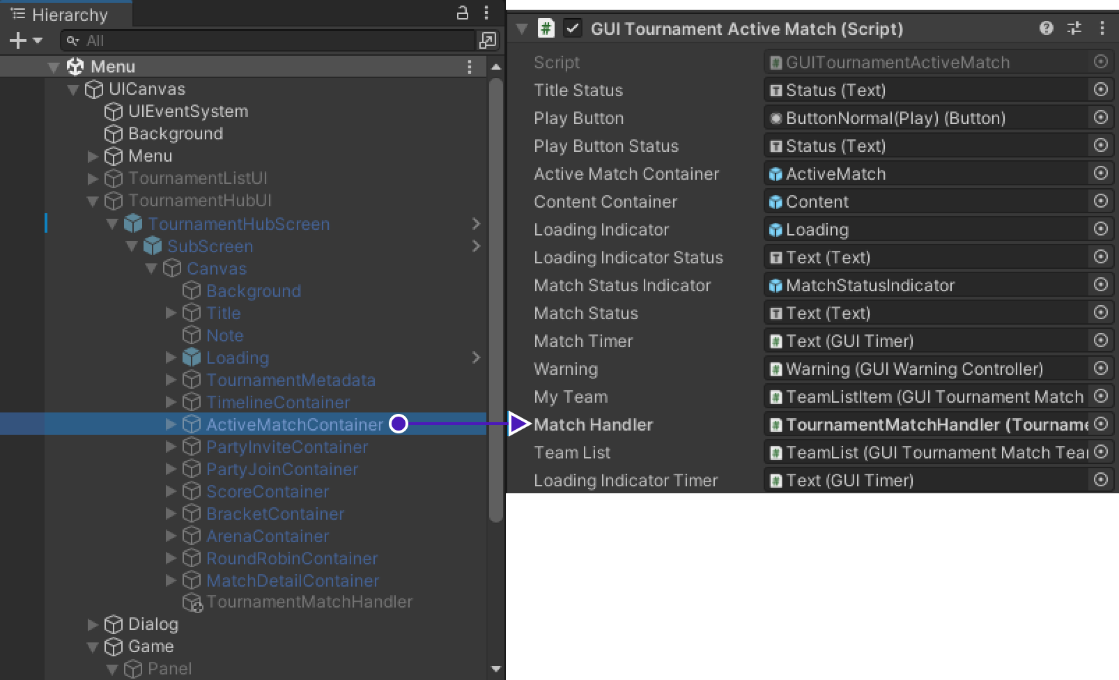 UICanvas > TournamentHubUI > TournamentHubScreen > SubScreen > Canvas > ActiveMatchContainer, find componentGUITournamentActiveMatchthere will be empty fieldMatchHandlerdrag&dropTournamentMatchHandlerinto it.