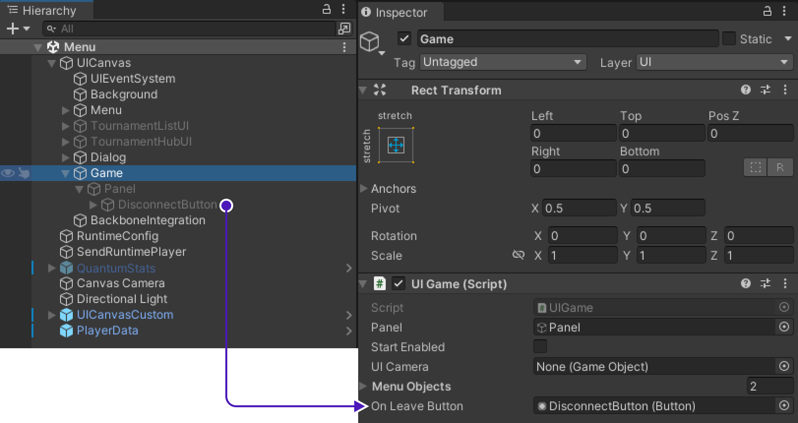 UICanvas > Gamethere is empty fieldOnLeaveButton, drag&dropUICanvas > Game > Panel > DisconnectButtoninto empty field.