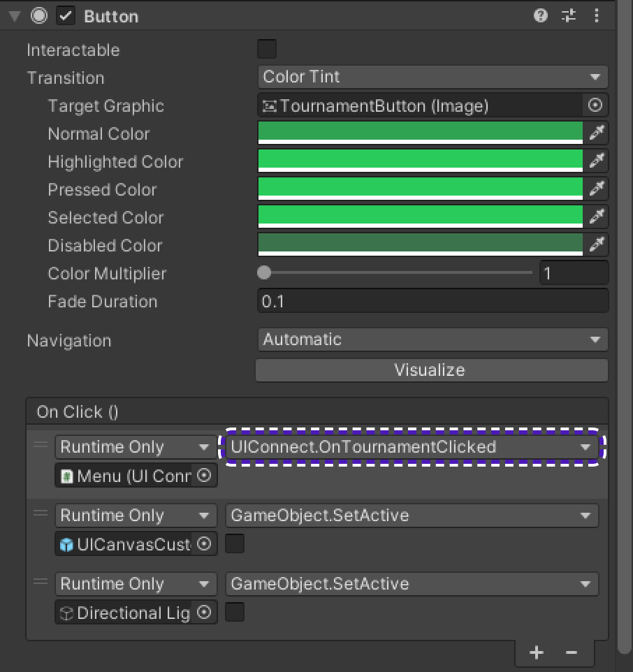 Buttoncomponent change firstOnClickaction fromUIConnect.OnReconnectClickedtoUIConnect.OnTournamentClicked.
