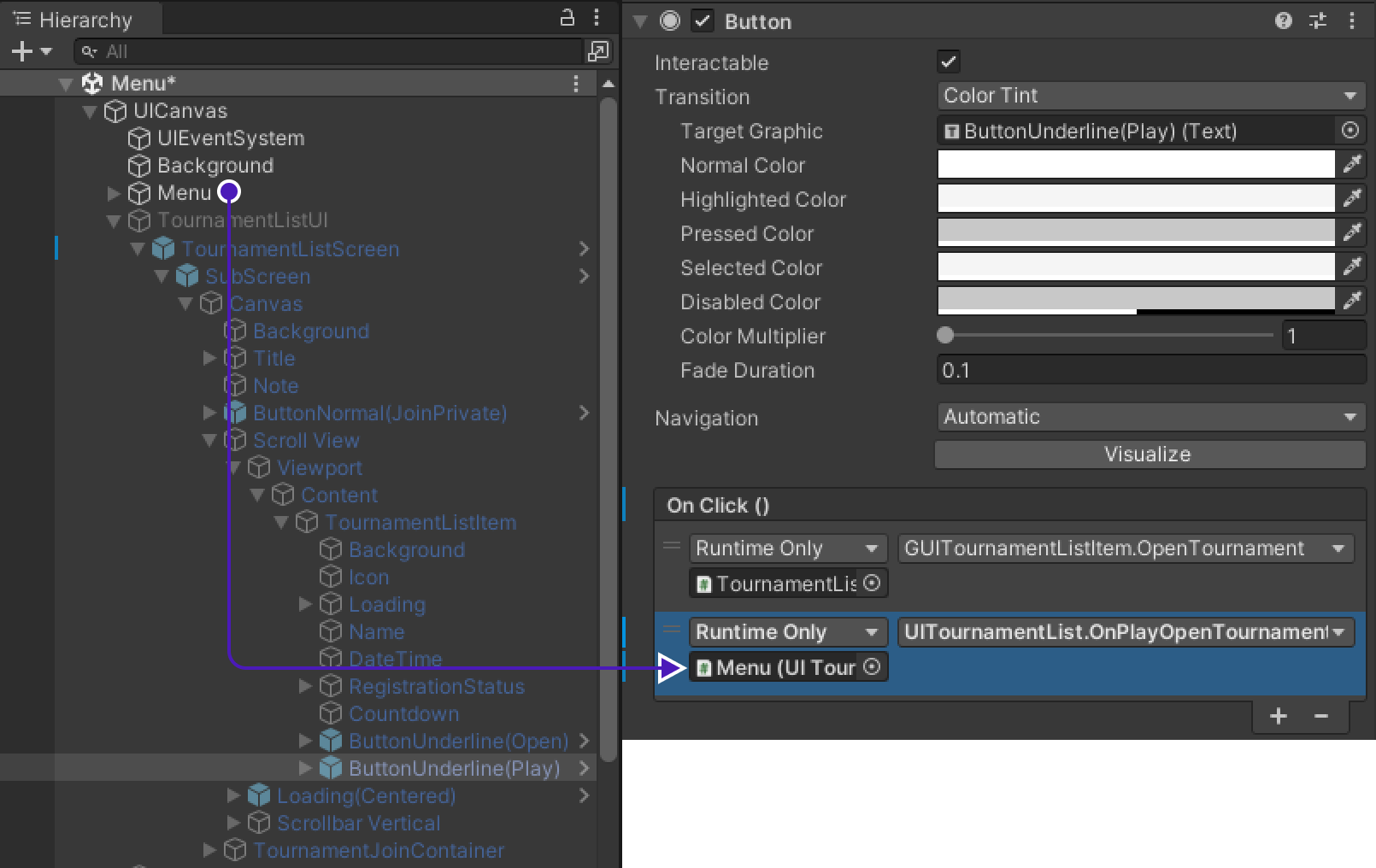 UICanvas > Menu > TournamentListUI > TournamentListScreen > SubScreen > Canvas > Scroll View > Viewport > Content > TournamentListItem > ButtonUnderline(Open)findButtoncomponent. -