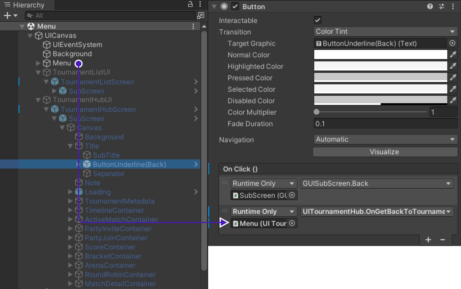 UICanvas > Menu > TournamentHubUI > TournamentHubScreen > SubScreen > Canvas > Title > ButtonUnderline(Back), findButtoncomponent. -