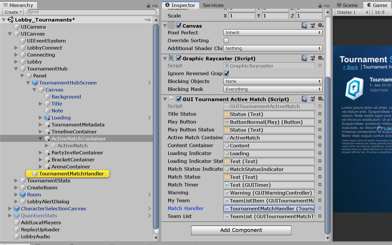 Then add object reference of TournamentMatchHandler to GUITournamentActiveMatch script, field MatchHandler.